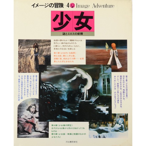 河出書房新社が70年代に刊行していた「イメージの冒険シリーズ」のなかでも人気の一冊「少女」です。少女のいる風景、少女幻想の世界、少女のエロス、少女像の原型と四章に分かれ、それぞれのジャンルで見られる「少女なるもの」を論じた濃密な号。宇野亜喜良、荒木経惟、合田佐和子、四谷シモンらのビジュアルに加え、矢川澄子や高橋康也、寺山修司に天沢退二郎など執筆陣も豪華、70年代という時代の中での少女像という文化論としても読み応えがあり、眺めるだけでも存分に陶酔できる魅力的な一冊です。ダストジャケット上部がサイズオーバーのためややわたみあり、若干割れやすくなっているページあり、それ以外は経年並みで古書として標準的な状態です。