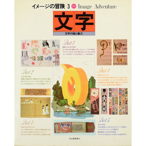 河出書房新社が70年代に刊行していた「イメージの冒険シリーズ」の一冊、こちらは「文字」がテーマ。「文字の謎と魅力」「未知の文字を求めて」など、文字の持つ不思議な力について様々な角度から述べられた、コンパクトながらも百科全書的な風合いも。谷川俊太郎の詩から始まり、寺山修司や赤瀬川原平、安野光雅ら豪華な執筆時が文字の世界を彩ります。このシリーズならではの編集で文字の魅力にアプローチする読みごたえある一冊。最終ページの上部角に折れあり、それによる若干の黒ずみあり、それ以外は全体的なくたびれ等はありますが、いずれも経年並みで古書として標準的な状態です。