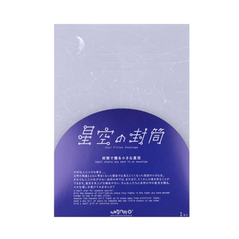 封筒で贈る小さな星空。開封口から覗くと目の前に星空が広がる、何ともロマンチックな「星空の封筒」です。見える星空は、新潟の冬の空、午後8時を想定し、オリオン座も確認できます。不思議と奥行きがあり、優しい光に癒されます。2015年に開催した「ペーパーカードデザインコンペ2015」優秀賞受賞。デザインは塚田萌さん、制作は空気の器でおなじみのかみの工作所です。送られた方に封筒の使い方がわかるよう、パッケージの台紙裏より丸いシートを切り取って同封してください。封筒裏にメッセージを書いたり、お手持ちの便箋をいれていただくこともできます。また、120円切手を貼ると定形外郵便で郵送することができます。