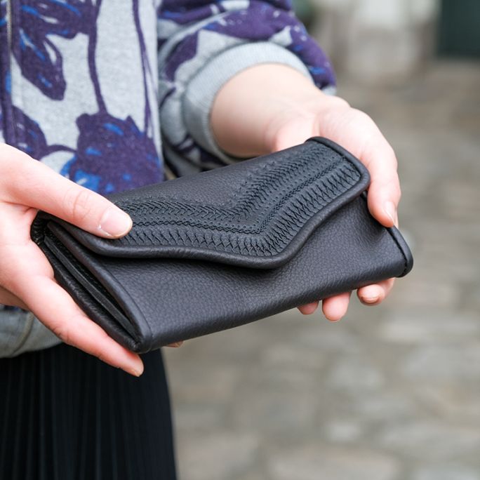 こちらは、たっぷりと刺繍をあしらった蓋が特徴の「stitch long wallet 刺繍入り長財布」です。曲線がフェミニンな印象。タンニン鞣しの革を使用していますので、お使いいただくうちに自然なツヤがでてきます。6枚収納できるカード段つき。小銭入れ部分は大きく開くファスナー開き。麻糸の手刺繍の立体感で、革と同色の刺繍でも表情のある仕上がりとなっています。世界の各地の民芸品をヒントに図案化した刺繍は、無国籍な印象なので様々な装いや持ち物とよく合います。飾らない日常生活のなかで、日々愛着や味わいが増していくレザーアイテム。付属の巾着袋に入れてお届けいたします。