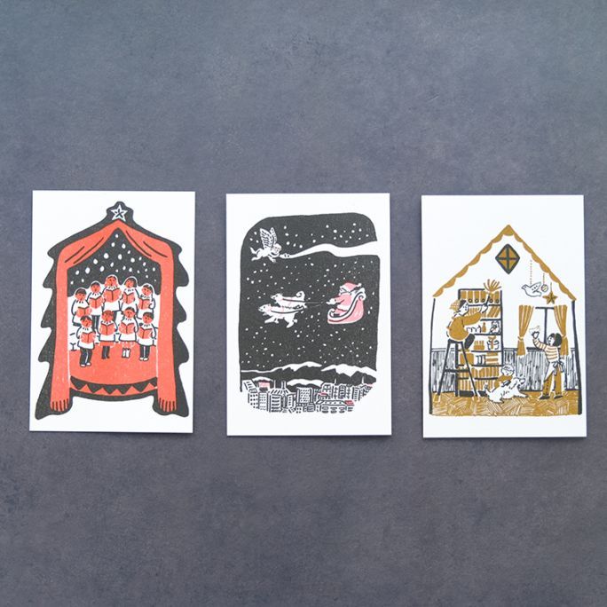 イラストレーター、グラフィックデザイナーとして活躍する梢夏子さん。これまでカレンダー用に書き下ろされたイラストから、よりすぐりのシーンがポストカードになりました。子どもたちの讃美歌が響く「Chorus」、空を飛ぶサンタクロース「Jingle Bells」、冬のお部屋を描いた「OOSOUJI」の3種をセットにしてお届けいたします。宛名面は余白が多めですので、メッセージをたくさん書き込んでいただけます。冬のお便りとしてはもちろん、贈り物に添えるカードとしてもご活用ください。
