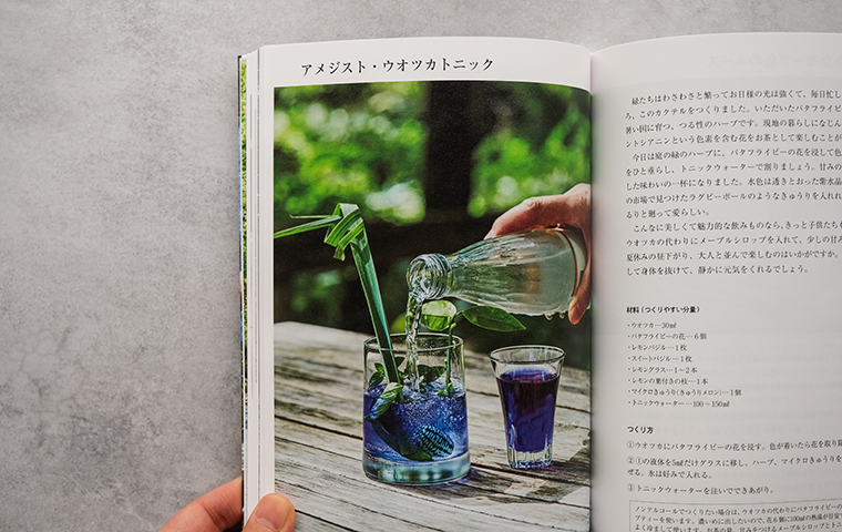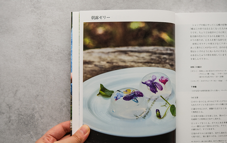 テーブルに広がるのは、色とりどりの豊かな季節の情景。"香りの薄衣"、"森の小道のジュレ"、"麗しき花のマーチ"、"太陽の光降るアイスティー"、"満月のプリン"、"銀色三日月ワイン"、"つややかなバラのムース"、"楽園のメレンゲ"…。季節の恵みにかぐわしいハーブを合わせ、草花あふれる景色がまるで目に浮かぶような美しい名のつけられたレシピが並びます。