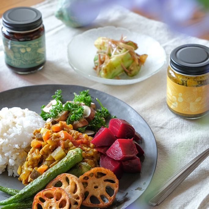 動物性・小麦粉不使用。油も控えめなため、胃もたれせずするりと食べられるところも嬉しい。泉州産玉ねぎと甘酒の滋味ある甘さにスパイスが香る、やさしい味わいのカレーペースト。隠し味の味噌で深みのある味わいに。辛さが苦手な方にもおすすめ。