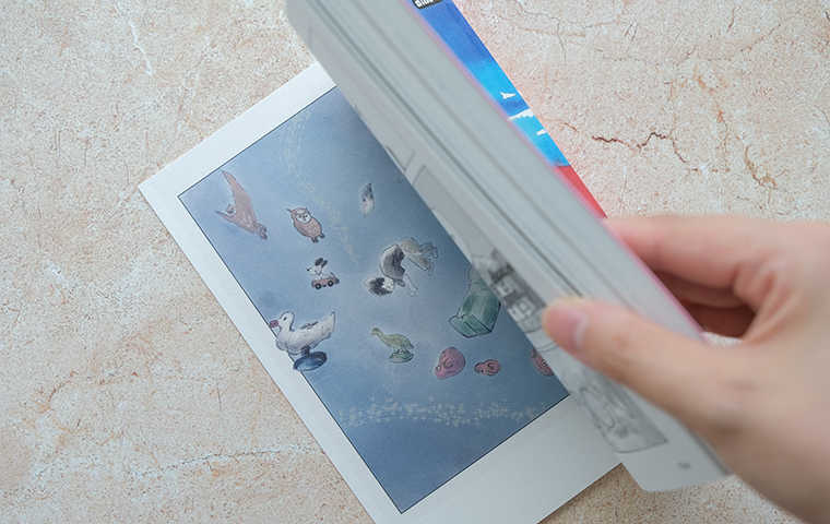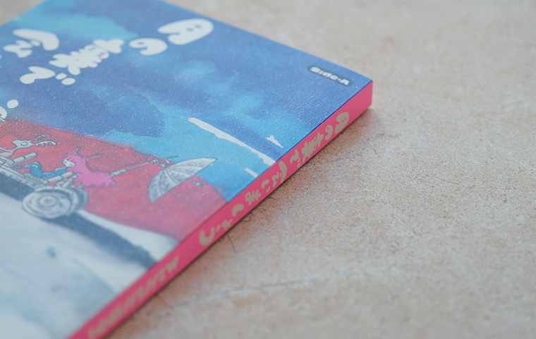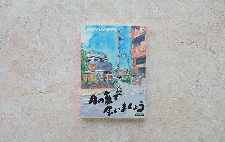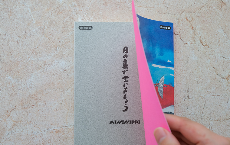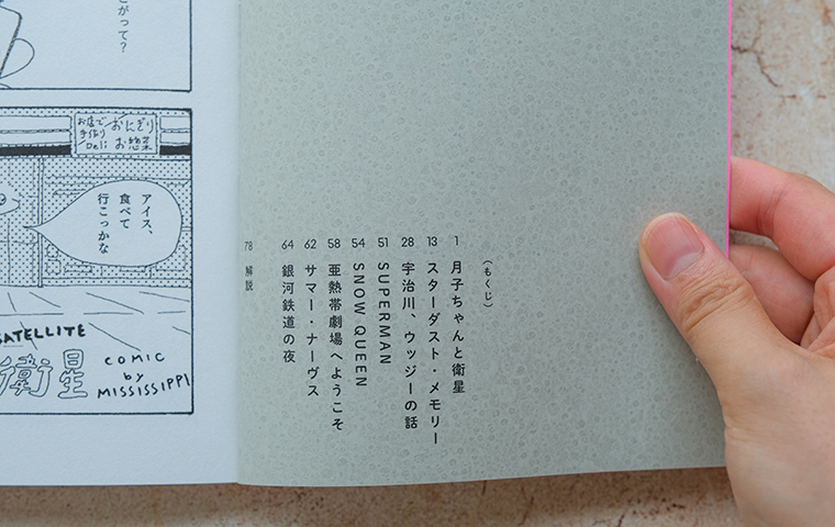 またコミックの短編作品集には珍しく、両面開きの仕様。足取りかるく、グローバルに活動するMISSISSIPPIさんならではの特別なもの。Side-Aはセリフが縦書きの作品、Side-Bは横書きの作品です。ポップで工夫の効いた装丁を担当したのは、合同会社 飛ぶ教室の森敬太さん。