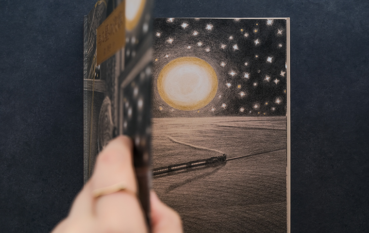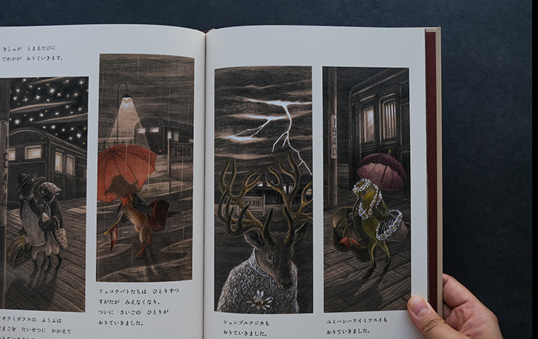 森洋子さんならではのタッチで描き込まれた、物悲しくも美しい物語。駅の数字が表すものに気が付くと、もう一度ページをめくりなおさずにはいられません。星々を照らす月明かりはしかしあたかかく、希望さえ感じさせます。それから動物たちの表情の豊かなこと。汽車を見送る動物、席に座って窓の外を眺める動物、それぞれの目に映る景色にそっと思いを巡らせます……。(藤林)