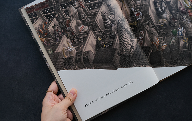 一本の汽車が、沢山の乗客を乗せて広い大地を走っています。星柄の手ぬぐいで汗を拭くホッキョクグマ、水玉の長靴をはいたイリオモテヤマネコ、卵を大事に抱えたオオウミガラスの夫婦、それから「きょうは みごとな つきね。とおぼえしたくなっちゃうわ」というのはおおかみの奥さんたち。車内はぎゅうぎゅう、とってもにぎやかな車内を、ひとりの男の子が歩いています。