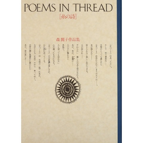 ファブリック・ピクチャーの第一人者にして、針と糸の詩人、森麗子の作品集。糸の詩というタイトルの通り、本書では、自然や動物、街や風景など、様々なパターンを自在に布にのせて、その独特の美しい世界を創りあげています。小鳥のいる風景、木々の間に落ちる夕陽、北国の夏の夜...。見事な技術とともに類まれなこの人だけの芸術が花開いた素晴らしさ。優しくどこか淋しげで、そして懐かしい、そんな森麗子の世界をこの大判の作品集でぜひ味わってください。函入り。巻末に献呈時の宛名つき署名入り。特に目立ったダメージはなく、古書として普通の状態です。