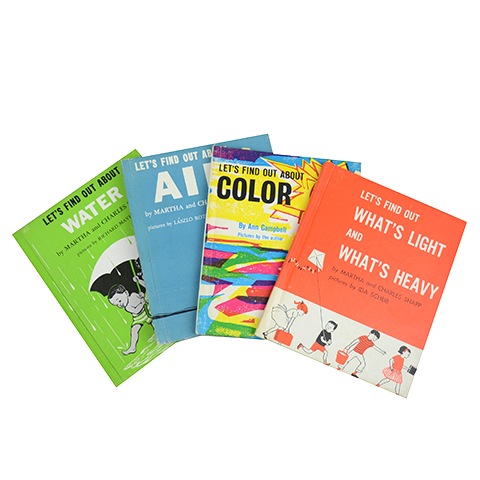 1960年代に刊行されていたアメリカの知育絵本「Let’s find out」シリーズ。こちらでは、その中から自然科学に関する4冊をセットにしてお届けします。「水」「空気」「色」「重さと軽さ」。平易な英語で子どもたちにもわかりやすく、愛らしく懐かしい絵で親しみやすさを。60年代の知育絵本の魅力が詰まっているとともに、英語の学びにも役立てることができるシリーズです。とにかく、その独特のノスタルジックな雰囲気が大いなる魅力です。一冊ずつにソノシートが付属していますが、検盤はしておりませんのでご了承ください。他、経年並のくすみ等はありますが、年代を考えると古書として標準的な状態です。