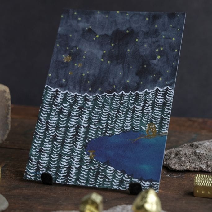 深い夜の森の中に佇むフクロウやキノコ、きらめく星空。箔押しがアクセントになった奥行きのある美しいカードです。凸凹した質感も楽しい。季節のお便りとしては勿論、額装してお部屋に飾るのもおすすめです。