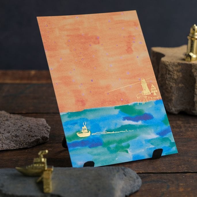 夕焼け空に一隻の船、そして灯台。静かな海の風景が、美しい色と箔押し印刷で表現された、奥行きのある美しいカードです。凸凹した質感も楽しい。季節のお便りとしては勿論、額装してお部屋に飾るのもおすすめです。