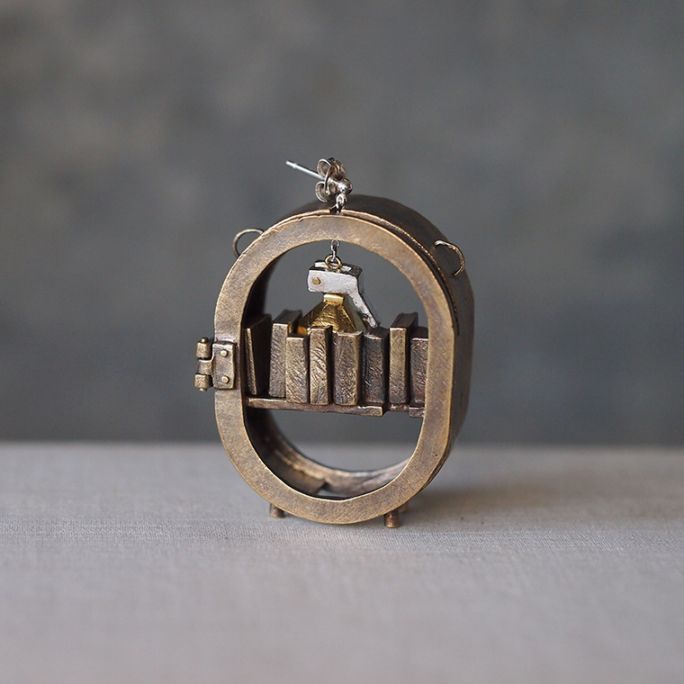 アールデコ調の丸い本棚。右から二番目の本を手前に倒すと、なんと本棚が開き、中には手榴弾モチーフのイヤリングが仕込まれています。まさしく檸檬の名場面が作品になったようで、作者の気持ちになって檸檬を置きたくなる、遊び心たっぷりの作品。