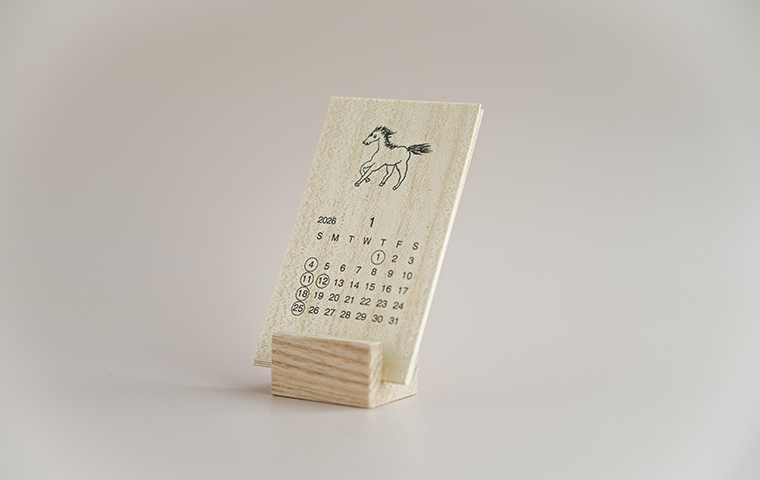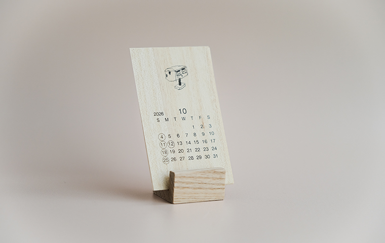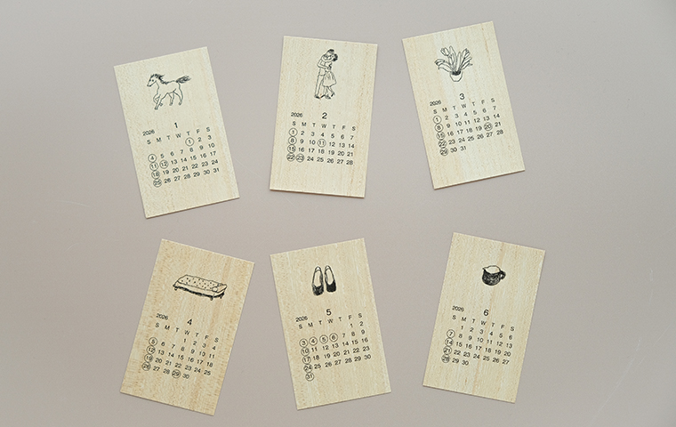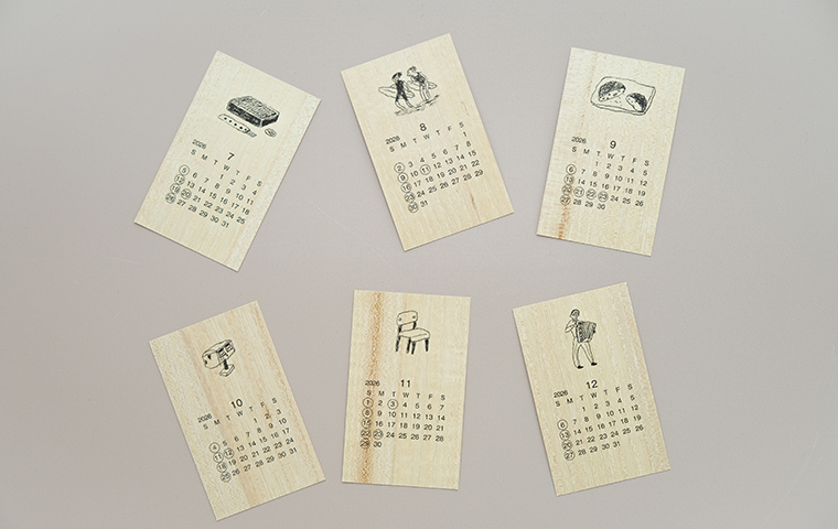 天然木材を使用したオーダー家具を提案する「木テーブル」のカレンダー。薄い桐の木の板にmitsouさん描き下ろしのやわらかくも芯のあるタッチのイラストをあしらった、当店でも毎年人気のカレンダーです。日々の暮らしの中で身近に木のあたたかみを感じながら、場所やシーンを選ばずお使いいただけるコンパクトなサイズ感です。木製のカレンダー立て付き。