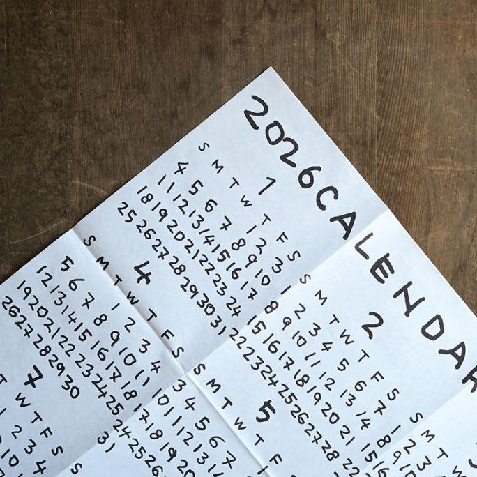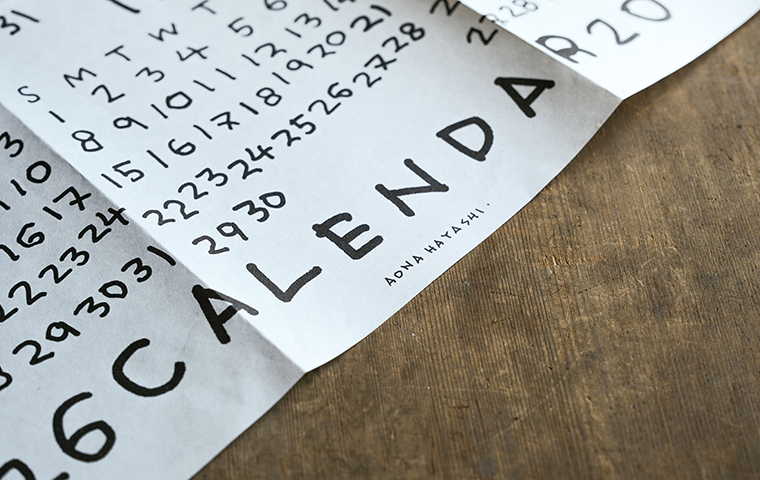 画家、イラストレーターの林青那さんによる、大きな一枚紙に刷られたポスター仕様のカレンダー。ひとつひとつの文字が踊るように描かれた、大胆で魅力的なカレンダーです。賑やかななかにも不思議な落ち着きのある文字と一年過ごしてみませんか。色は白と黒のみ。ぽっかり空いた壁に貼れば存在感を感じられるとともに、そのシンプルさでインテリアの一部ともなってくれそうです。