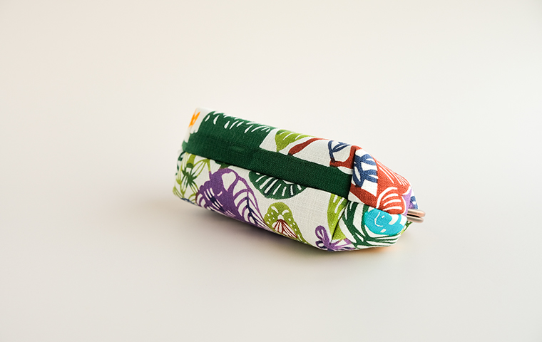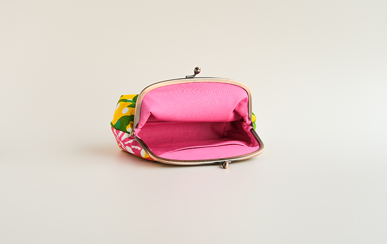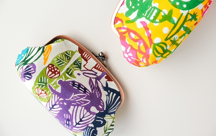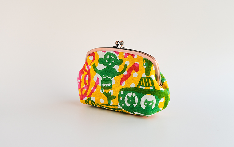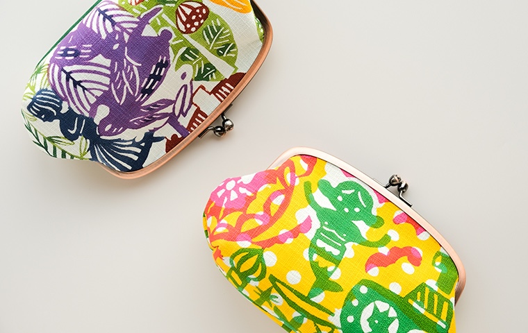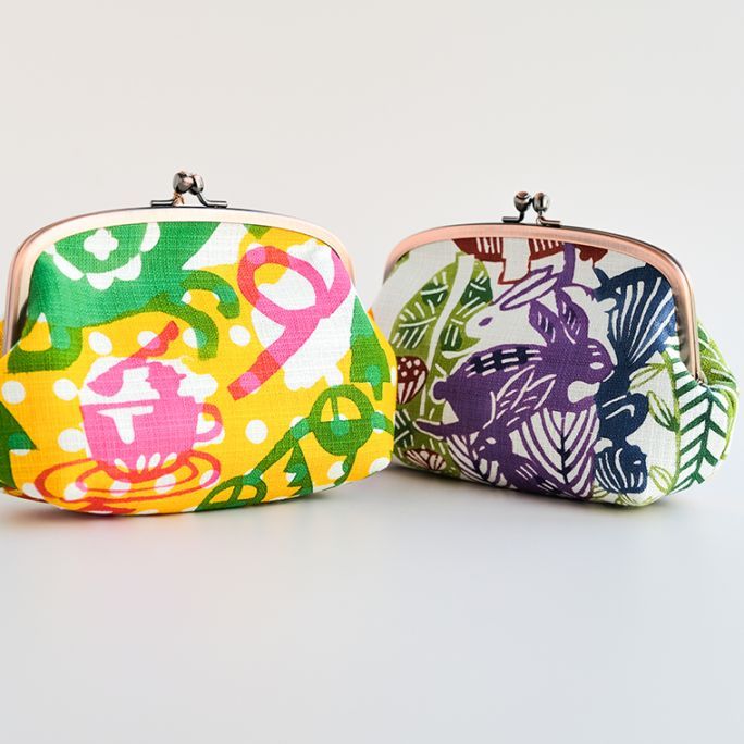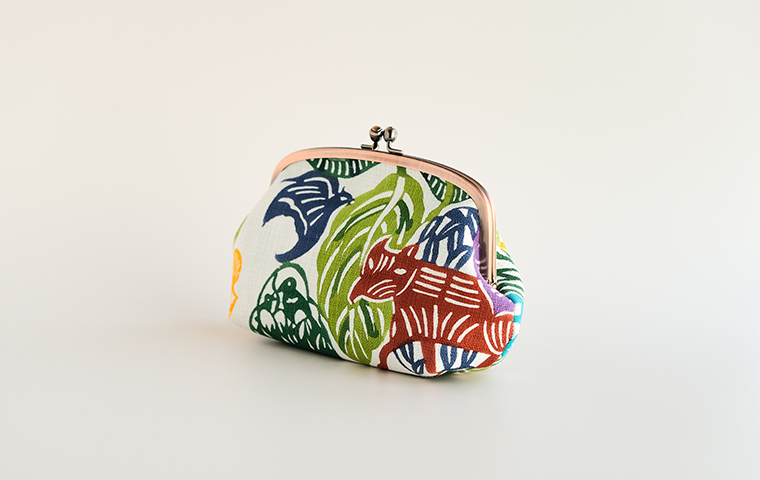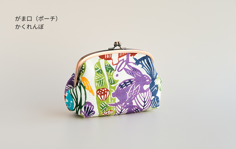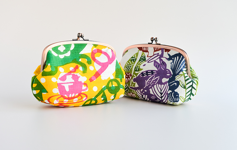 型染作家・関美穂子さんによる手染生地で仕立てた、ぽってりした形がかわいいポーチ型のがま口です。片側には内ポケットも付いています。しっかりマチがあるので、かばんの中のいろんな小物が上手に収納できそう。ご希望の絵柄を選択の上、ご注文ください。