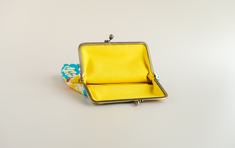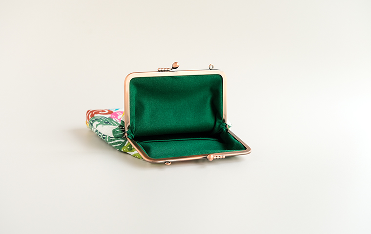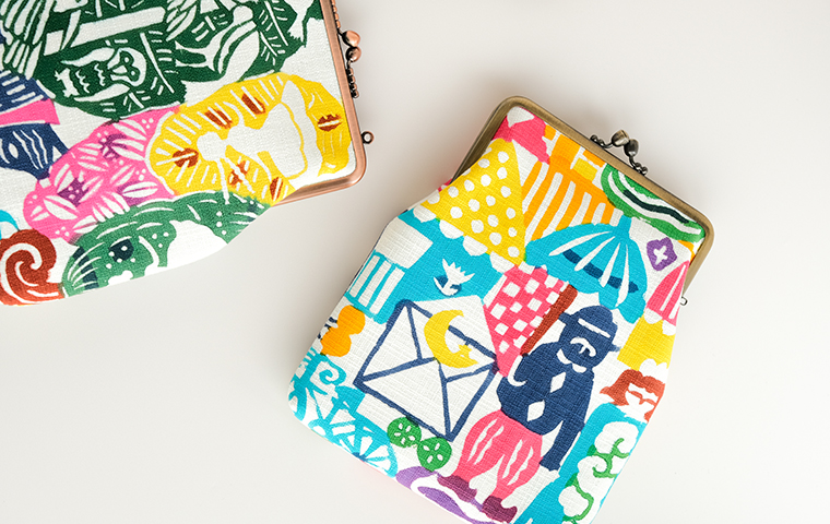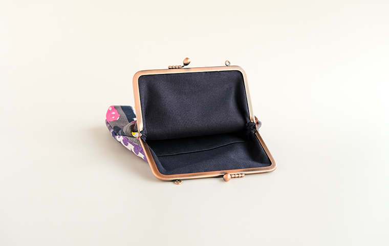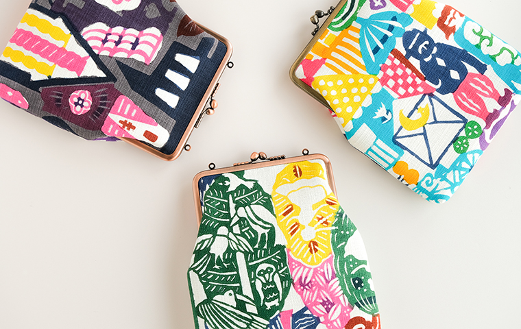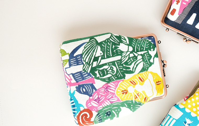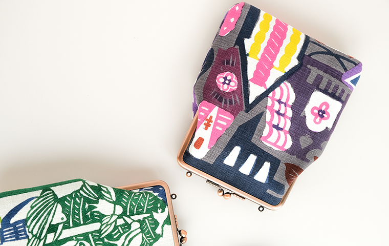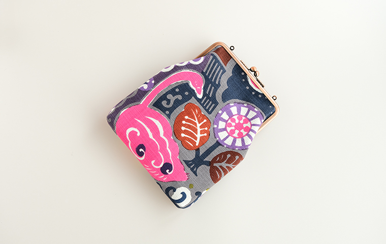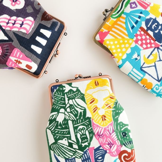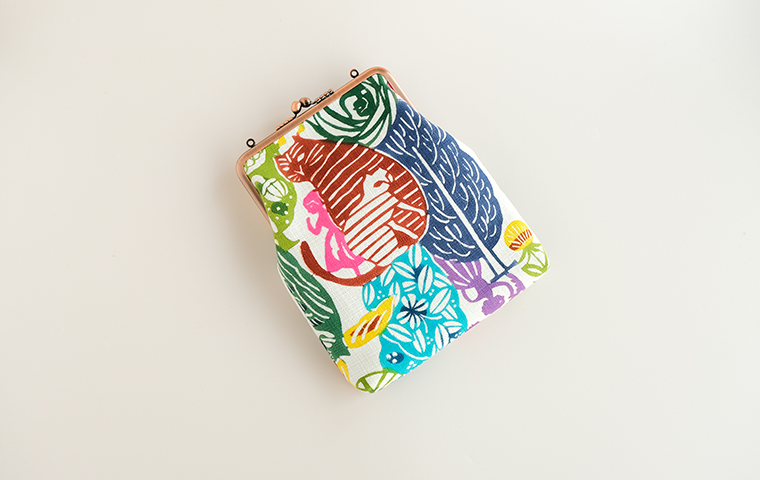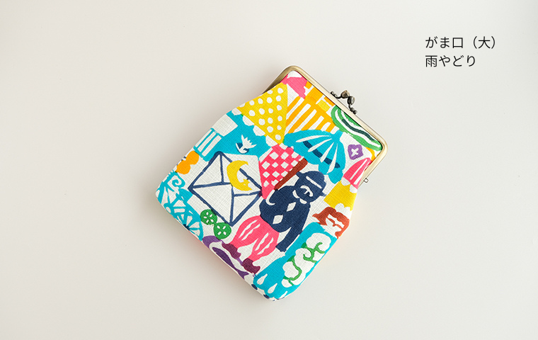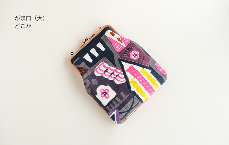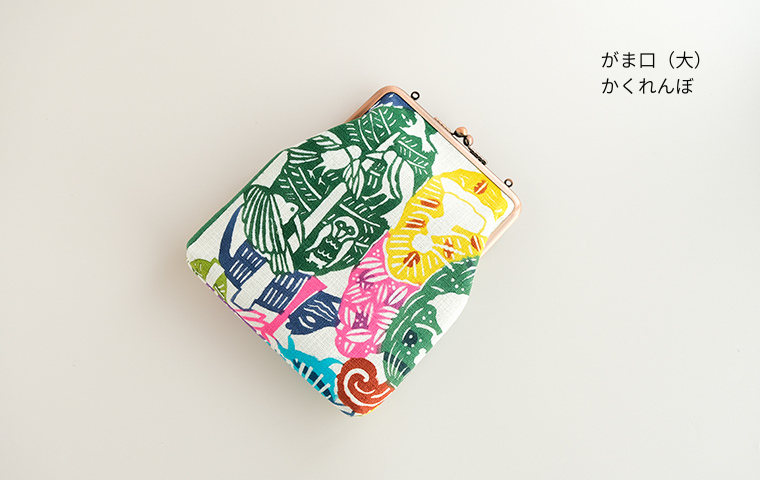 型染作家・関美穂子さんによる手染生地で仕立てた大きめサイズのがま口です。お財布やスマホもすっぽり入るけど、かばんの中でかさばらないスリムな形が使いやすい。片側には内ポケット付き。口金の左右にはリング穴が付いているので、お好きな紐やチェーンを付けていただくとポシェットとしてもお使いいただけます。ご希望の絵柄を選択の上、ご注文ください。