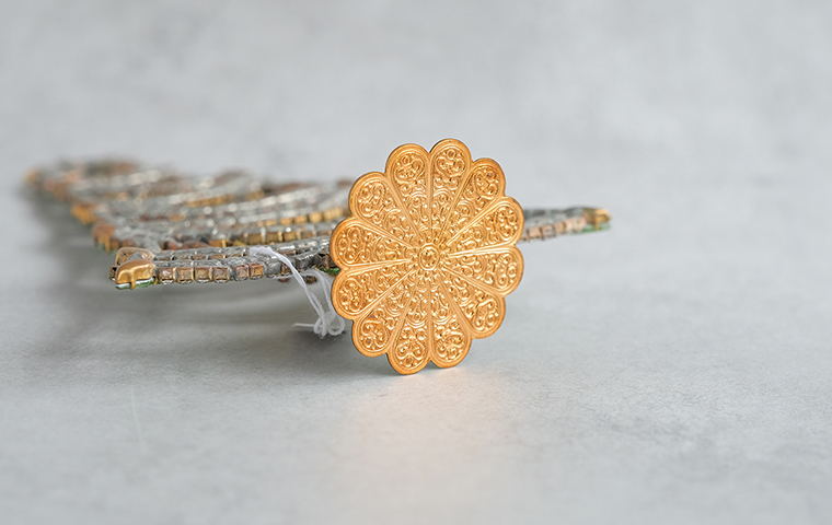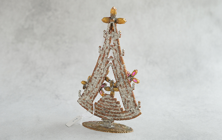 ラインストーンツリーは、ガラスパーツと真鍮(鉛フリー)を半田ごてで溶接してラインのように繋ぎ、足元に立たせる為の土台を付けて作られています。ツリーという形状から足元が歪んだり、斜めの状態で重みがかかると、変形したり折れたりしやくすなります。丁寧にお取り扱いくださいますようお願いします。