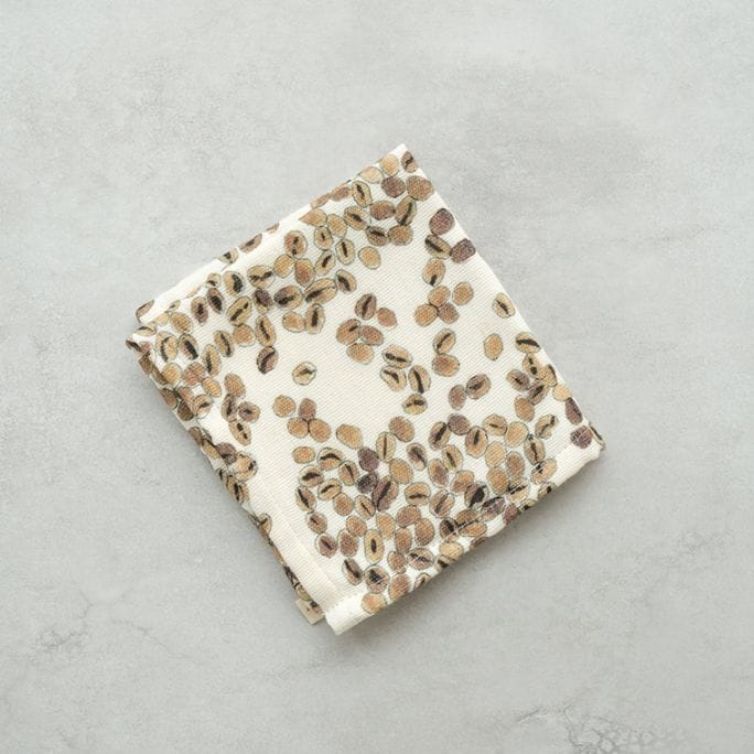 日傘・雨傘を生地から制作し、一本ずつ手作りで仕上げるイイダ傘店より、テキスタイル「コーヒー豆」を用いたミニタオル。肌触りの良いオーガニックコットン100%のガーゼ生地で、日常使いにぴったりです。ちょっとしたギフトにもおすすめ。(上田)